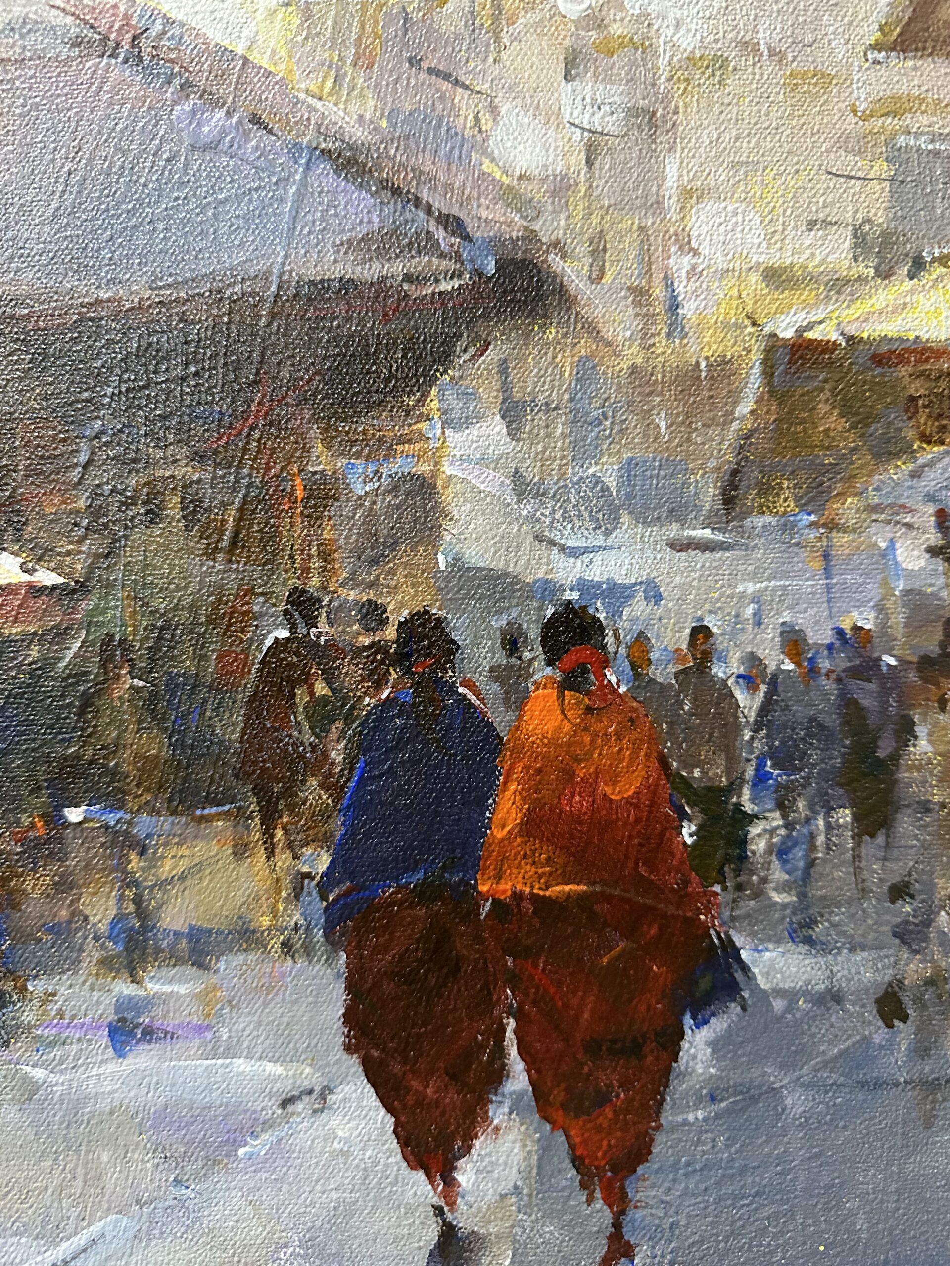 “Kathmandu’s Abstract Streets” is a captivating painting by artist Gyanmani Rai. Through bold brushstrokes and vibrant colors, Rai captures the bustling energy and cultural richness of Kathmandu’s streets in abstract form. Traditional motifs intertwine with modern elements, inviting viewers on a visual journey through the heart of the city.
